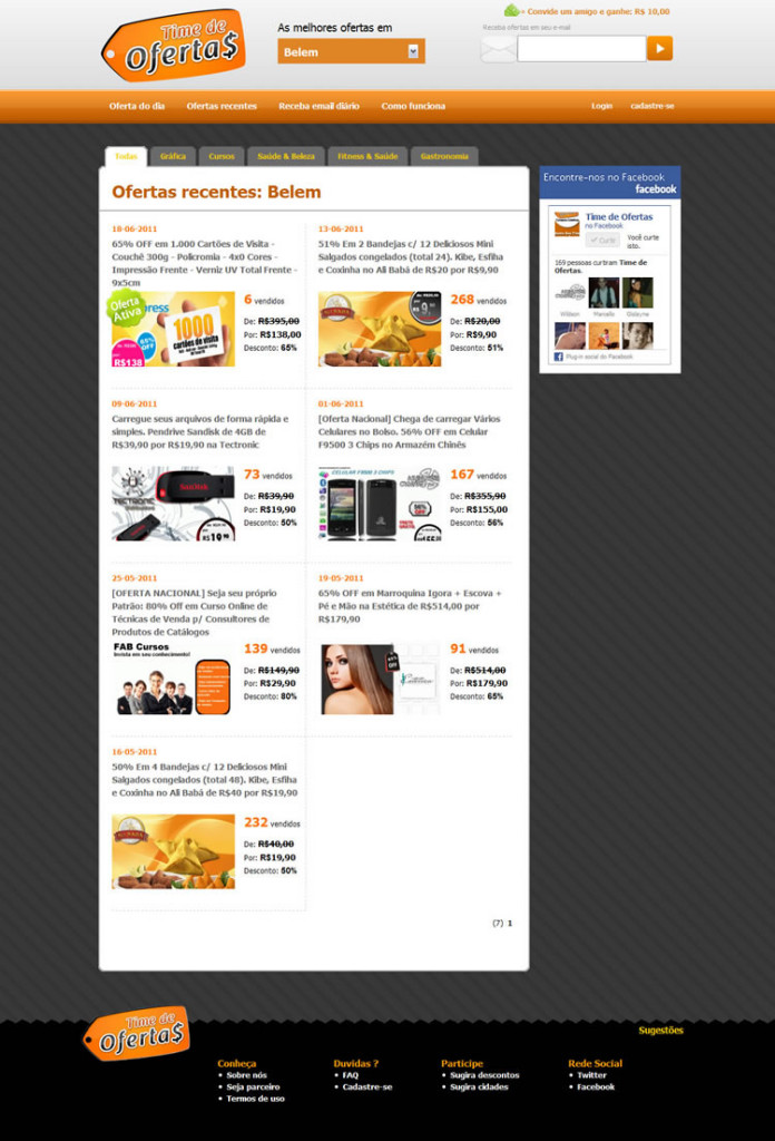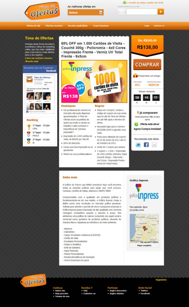 Time de ofertas Detalhes do projeto: Cliente: Time de Ofertas Itens desenvolvidos: Diagramação do site de compra coletiva www.timedeofertas.com/ e criação da página do Twitter @TimedeOfertas. Data: Maio/ 2011 Para mais informações entre em contato: